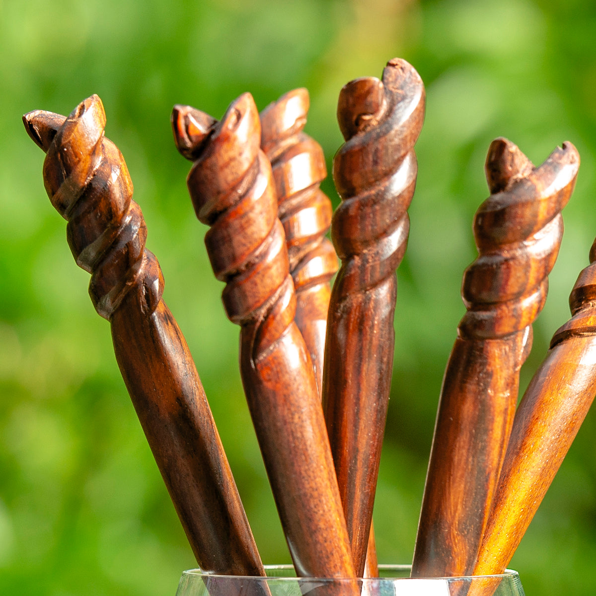 - Wooden Hair Sticks: Wooden hair sticks are iconic accessories in hippie fashion, symbolizing nature, simplicity, and bohemian flair. Crafted from sustainable wood, these hair sticks often feature intricate carvings, natural grains, and earthy tones, reflecting the organic aesthetics cherished by hippies. They offer a unique way to style hair, whether twisted into a loose bun, woven into a braid, or adorned with beads and feathers for added whimsy. Beyond their practical function of securing hairstyles, wooden hair sticks evoke a connection to the earth and a reverence for natural materials.